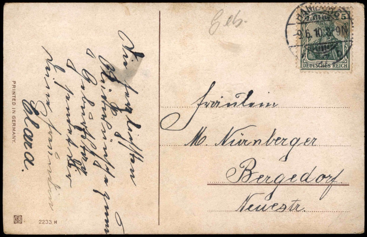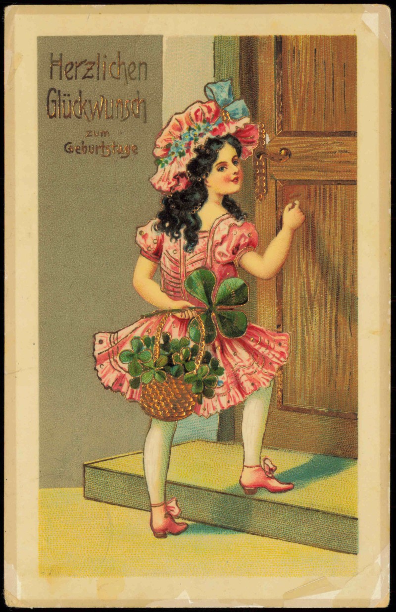 Postcart: Geburtstag Birthday Mädchen mit Kleeblätten Shamerock Goldprägekarte