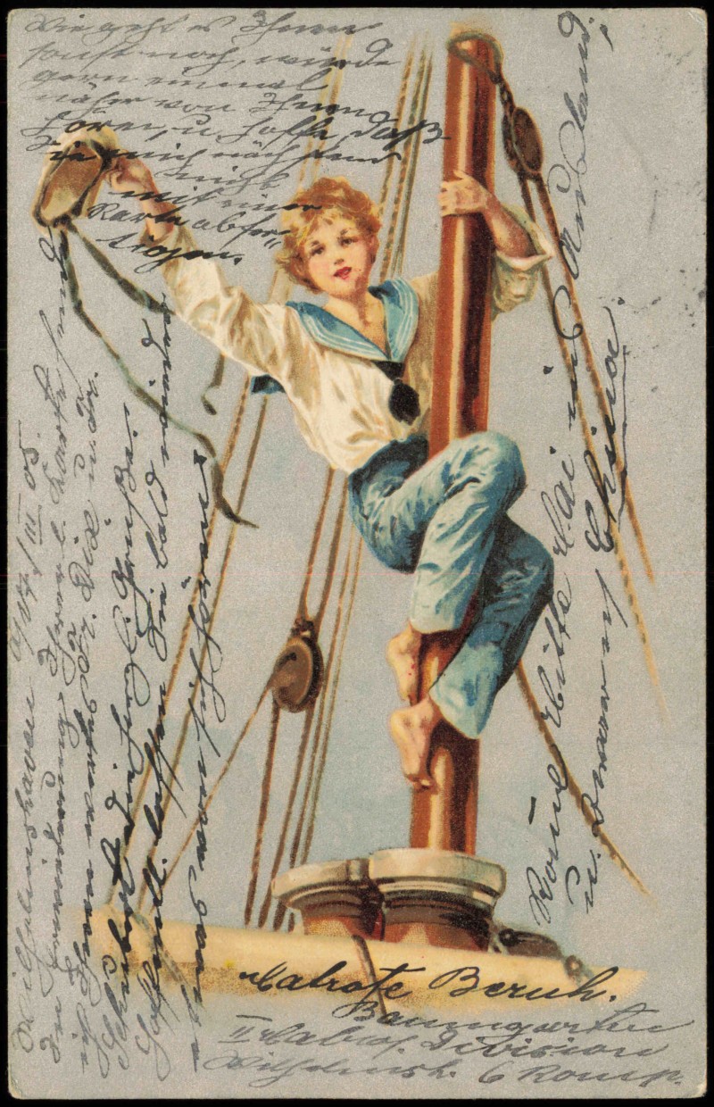 - Künstlerkarte Junge als Matrose am Mast Schiff