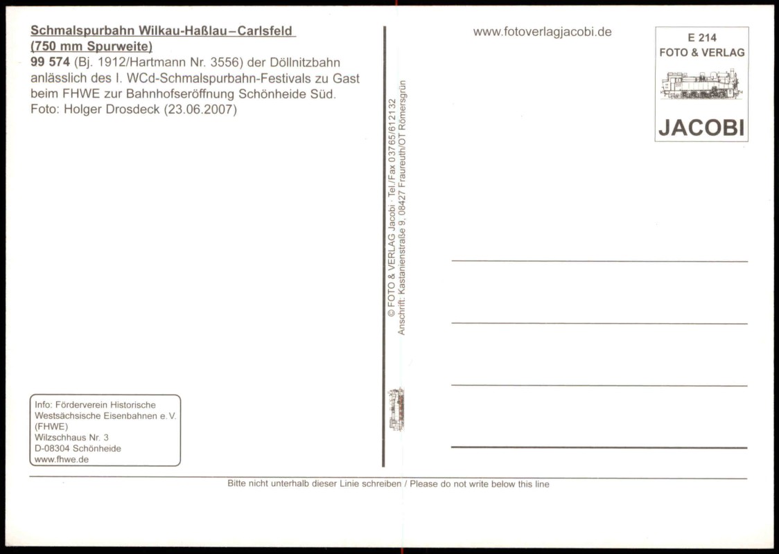 - 99 1574-5 674-5 Schmalspurbahn Wilkau-Haßlau-Carlsfeld (750 mm Spurweite) 99 574 (Bj. 1912/Hartmann Nr. 3556) der Döllnitzbahn anlässlich des I. WCd-Schmalspurbahn-Festivals zu Gast beim FHWE zur Bahnhofseröffnung Schönheide Süd. Foto: Holger Drosdeck (23.06.2007)