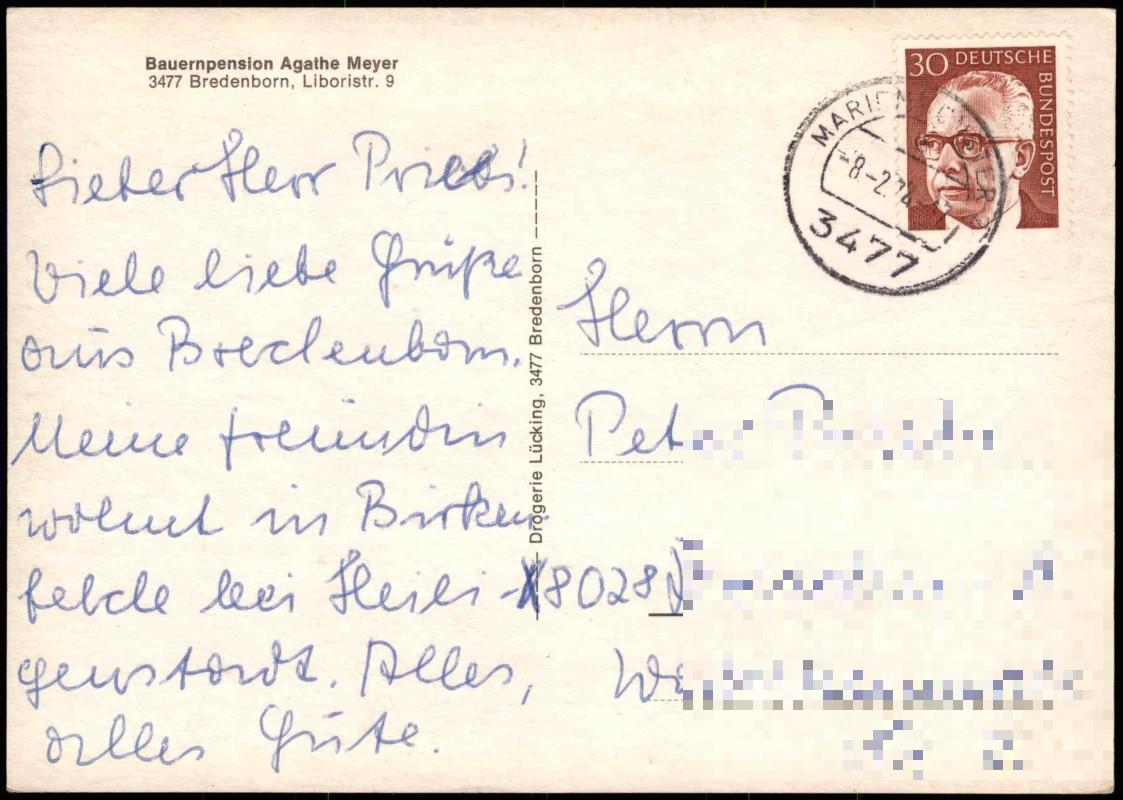 Postcart: Bauernpension Agathe Meyer, Liboristr. 9 - Bredenborn-Marienmünster