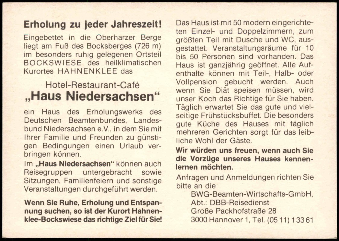 Photo Card: Reklame-Karte Hotel-Restaurant-Cafe HAUS Niedersachsen - Hahnenklee-Hahnenklee-Bockswiese-Goslar