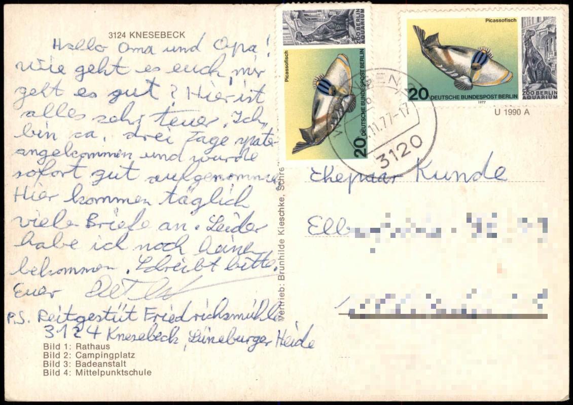 - Diese Mehrbildkarte zeigt vier Ansichten der Ortschaft Knesebeck in der Lüneburger Heide. Abgebildet sind das Rathaus, der Campingplatz, die Badeanstalt und die Mittelpunktschule. Die Karte wurde vom Vertrieb Brunhilde Kleschke herausgegeben.