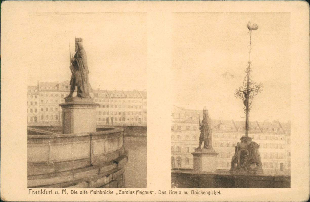 Postcart: 2 Bild alte Mainbrücke,,Carolus Magnus". Das Kreuz m. Brückengickel. - Frankfurt am Main