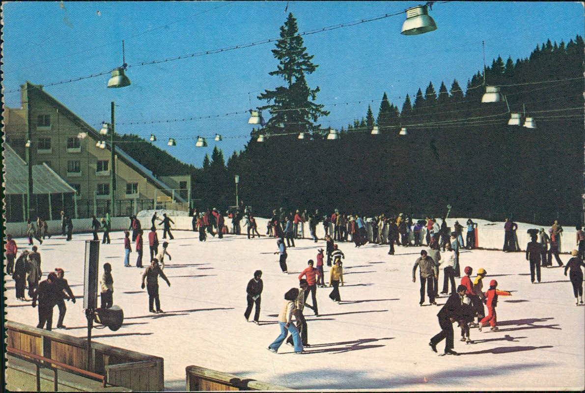 - Farbfotografie der künstlichen Eisbahn (patinoarul artificial) im rumänischen Wintersportort Poiana Brașov. Die Aufnahme zeigt zahlreiche Menschen beim Eislaufen vor der Kulisse eines alpinen Gebäudes und eines Nadelwaldes. Herausgegeben von Publiturism, Preisangabe Lei 1,50.