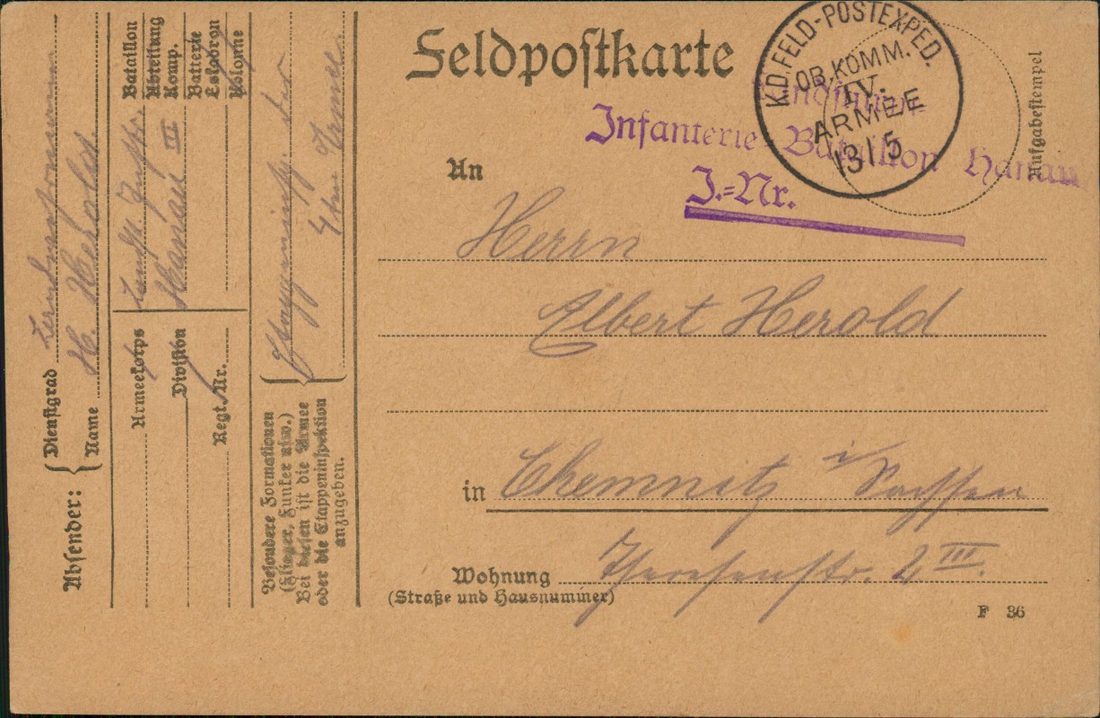 Postcart: Feldpostkarten 1. WK K.D. Feldpost Exped Oberkommando IV Armee