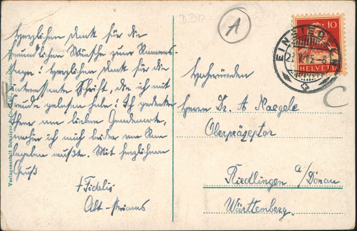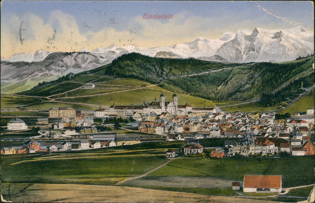 Postcart: Stadtpartie mit Bahnhof - Künstlerkarte - Einsiedeln