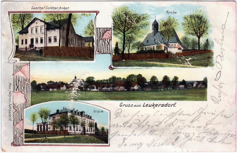 Postcart: 4 Bild: Gasthof, Schule, Kirche und Panorama - Leukersdorf-Jahnsdorf (Erzgebirge)