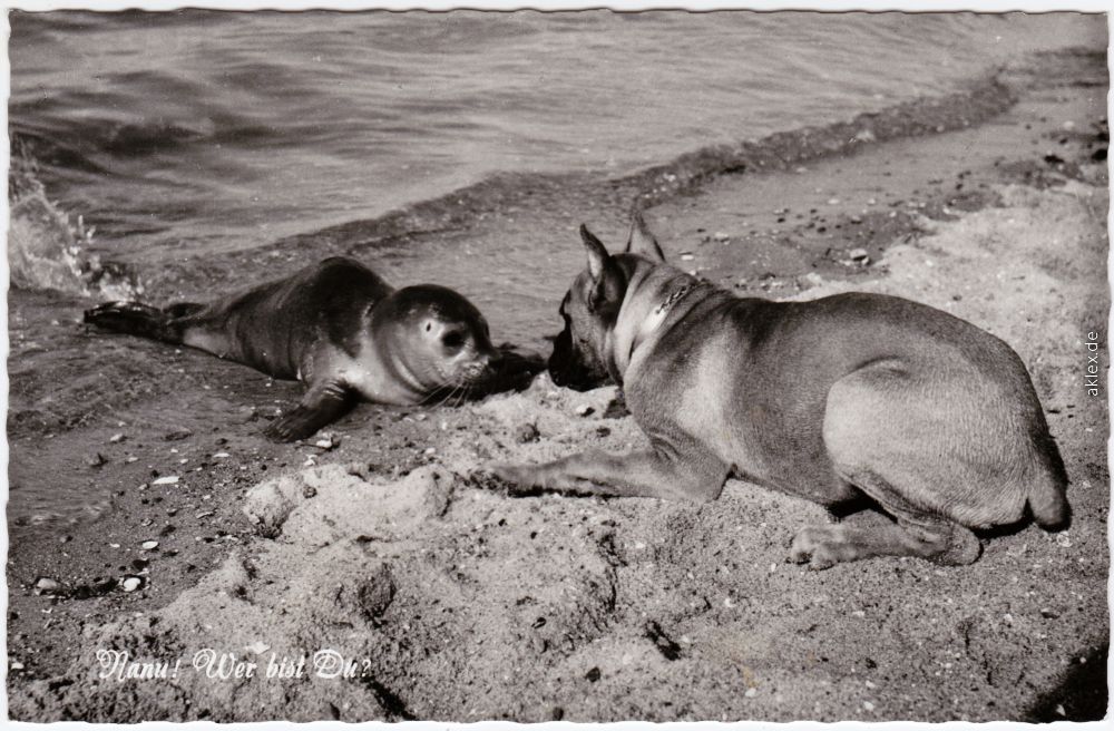 Photo Card: Seltsame Begegnung am Nordseestrand: Robbe und Hund