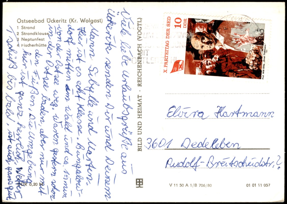 Postcart: Strand, Strandklause, Neptunfest, Fischerhütte - Ückeritz (Usedom)