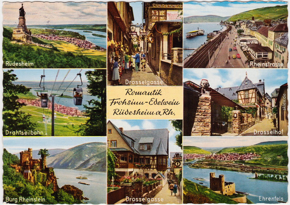 Postcart: Drahtseilbahn, Drosselgasse/Hof, Burgen, Rheinstraße - Rüdesheim (Rhein)