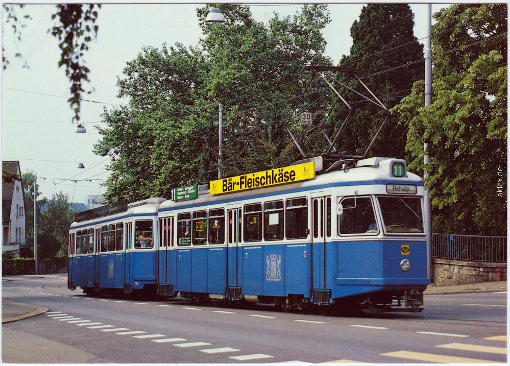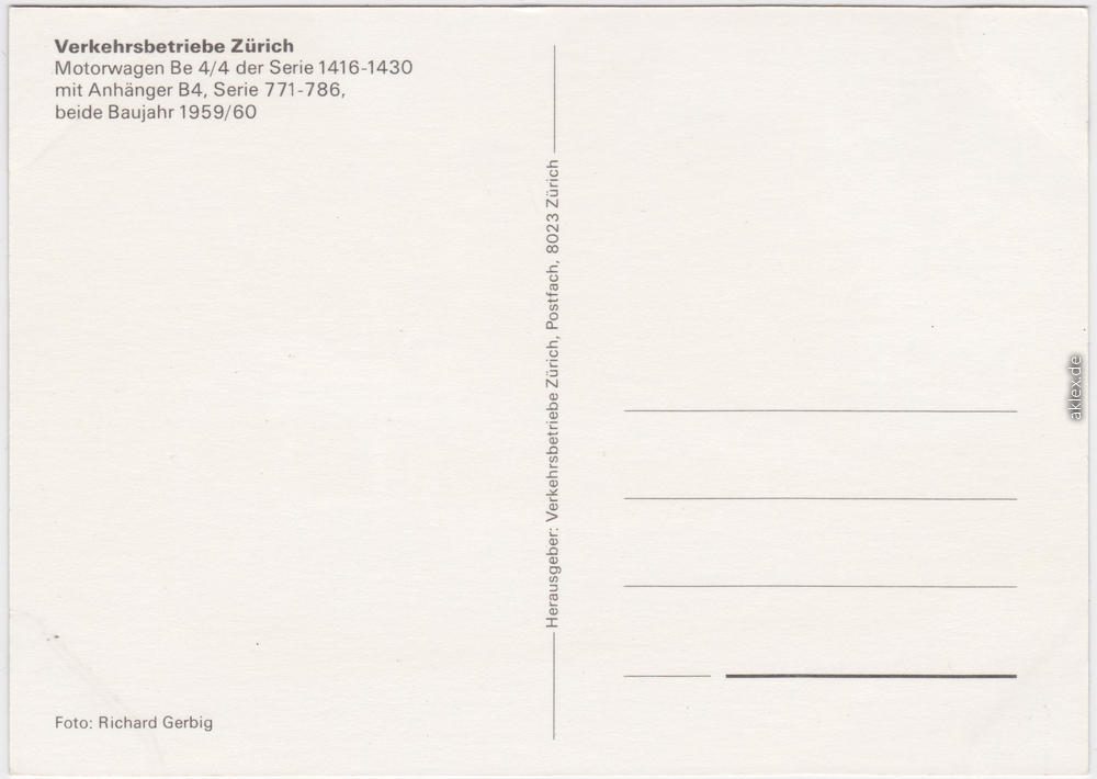 Photo Card: Verkehrsbetriebe Motorwagen Be 4/4 der Serie 1416-1430 mit anhänger B4, Serie 771-786, beide Baujahr 1959/60 - Zurich