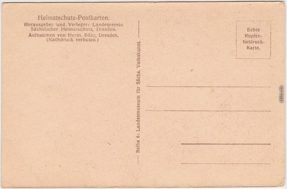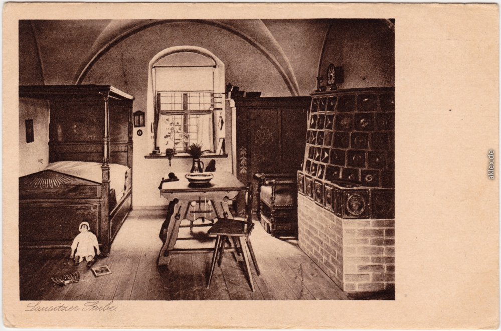 Postcart: Lausitzer Stube - Innenansicht mit Bett und Kachelofen