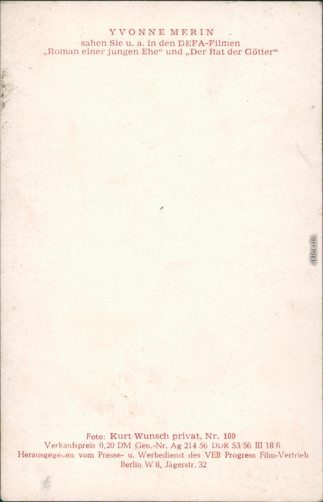 Postcart: Yvonne Merin - sahen Sie u.a. in den DEFA-Filmen "Roman einer jungen Ehe" und "Der Rat der Götter"