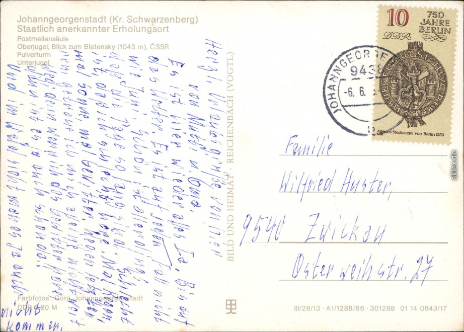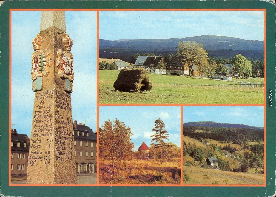 Postcart: Postmeilensäulen, Oberjugel - Blick zum Blatensky 1043 m Hoch, Pulverturm, Unterjugel - Johanngeorgenstadt