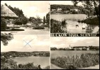 Postcart: Im Stadtpark, Blick auf den Schermützelsee, Silberkehle, Volksbad am Schermützelsee, Wurzelfichte - Buckow (Märkische Schweiz)
