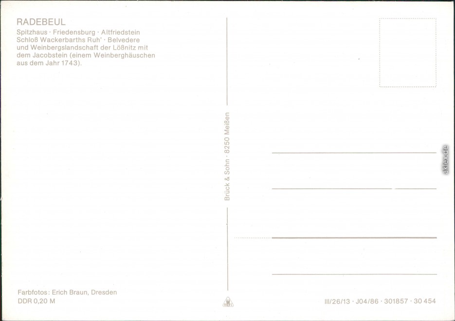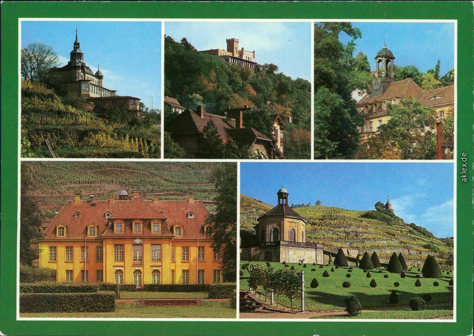 Postcart: Spitzhaus, Friedensburg, Altfriedstein, Schloss Wackerbarths Ruh', Belvedere und Weinbergslandschaft der Lößnitz mit dem Jacobstein - Radebeul