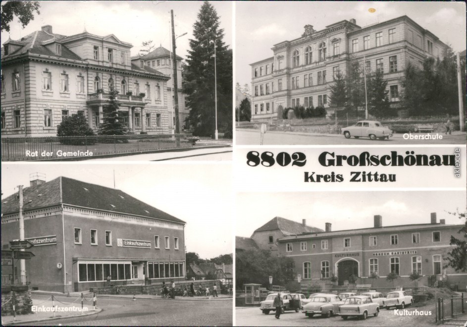 Postcart: Rat der Gemeinde, Oberschule, Einkaufszentrum, Kulturhaus - Großschönau (Sachsen)