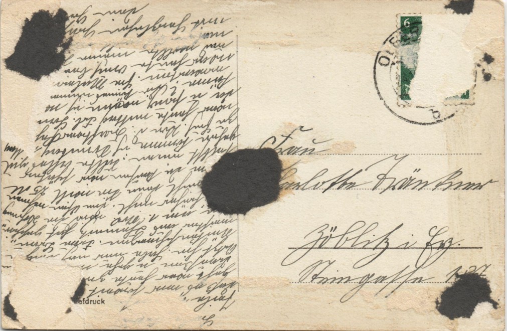 auf der Rückseite Kleberückstände und abgerissenes Papier