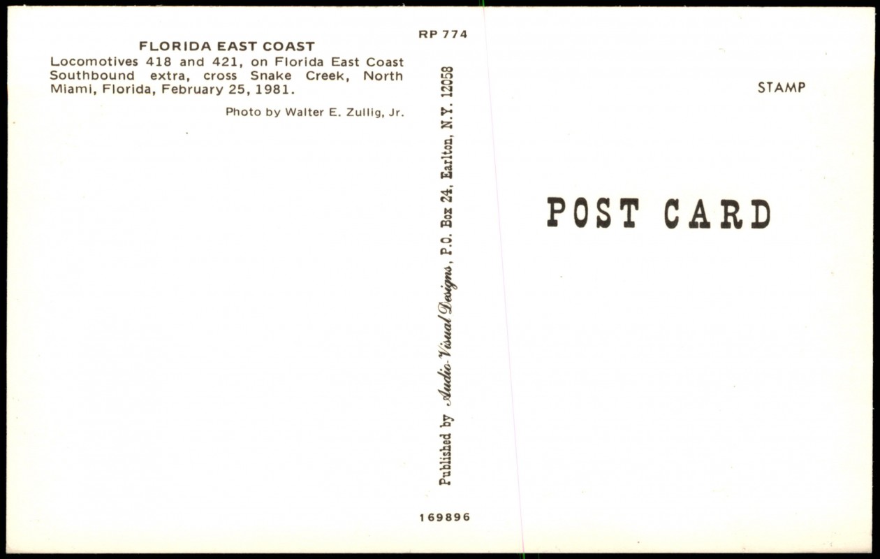 Photo Card: FLORIDA EAST COAST Train near Snake Creek North Miami Eisenbahn Railway