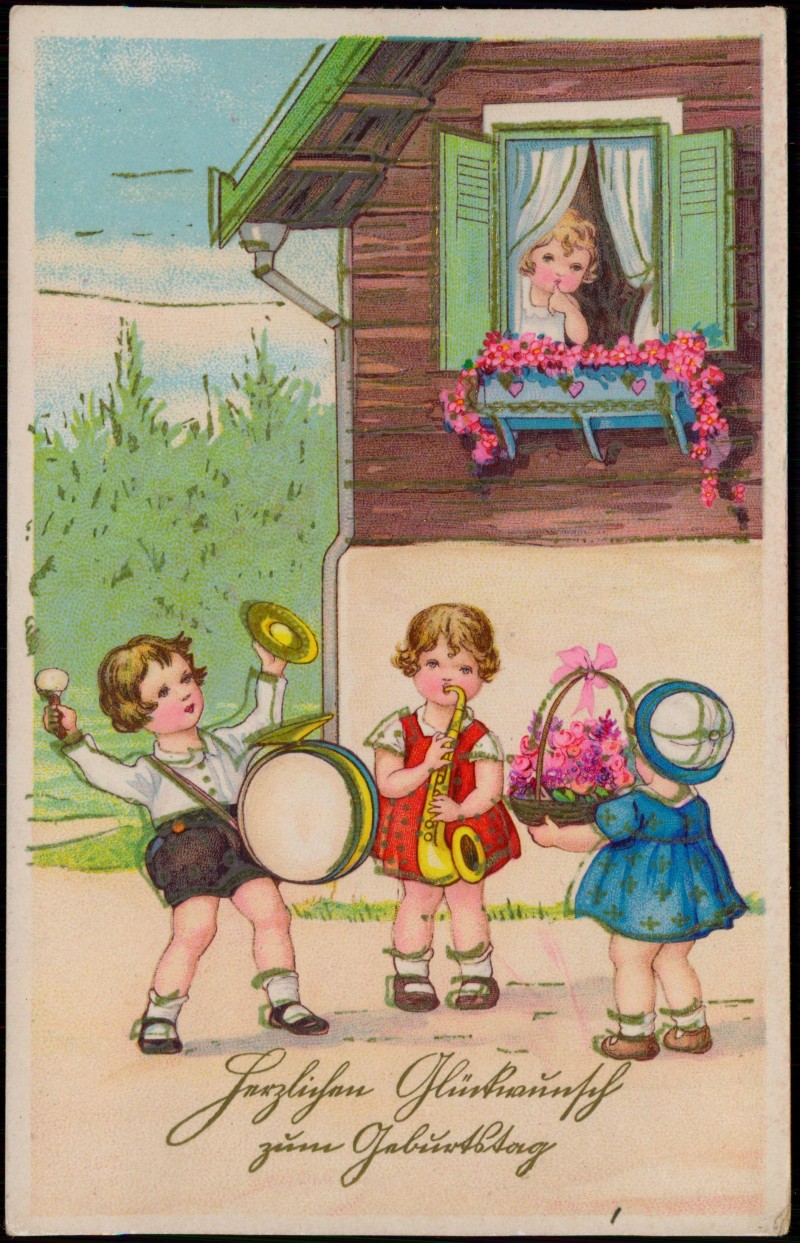 Postcart: Glückwunsch Geburtstag Birthday - musizierende Kinder