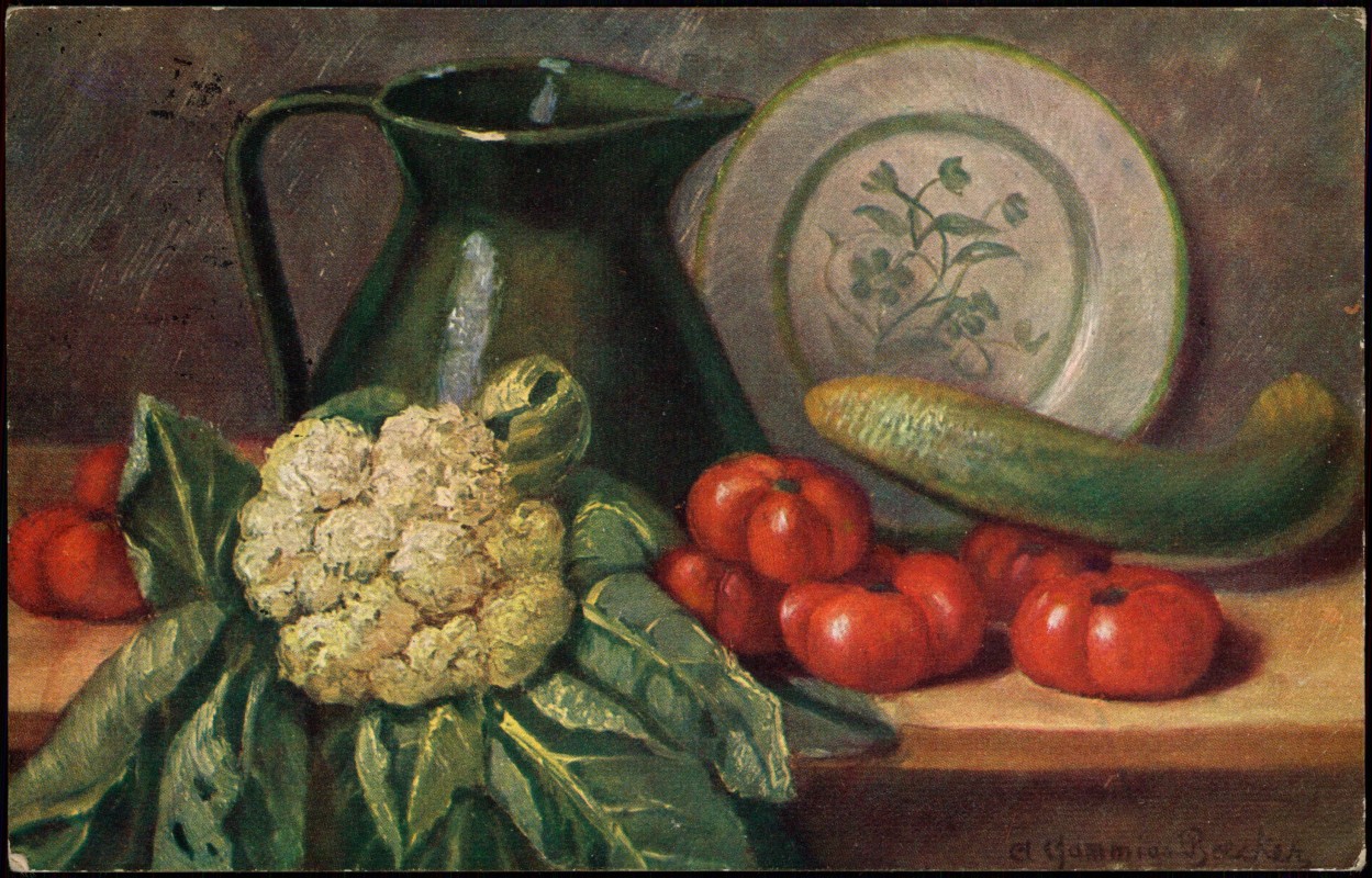 Künstlerkarte Stillleben Tongeschirr Gemüse