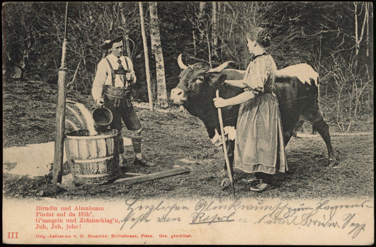 Postcart: Bayern, Dirndln und Almabuam Typen Trachten - .Bayern