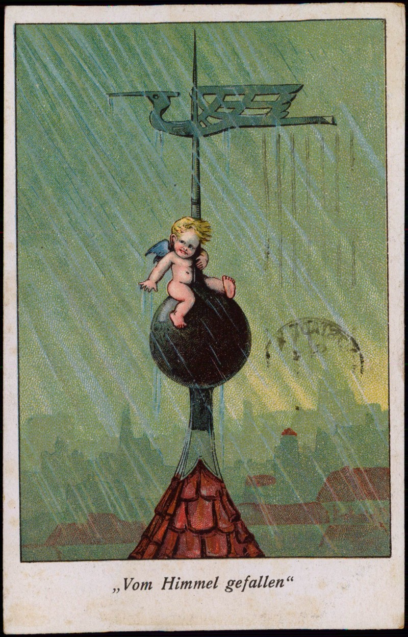 Postcart: Motiv: Engel Angel hält sich am Wetterhahn Vom Himmel gefallen