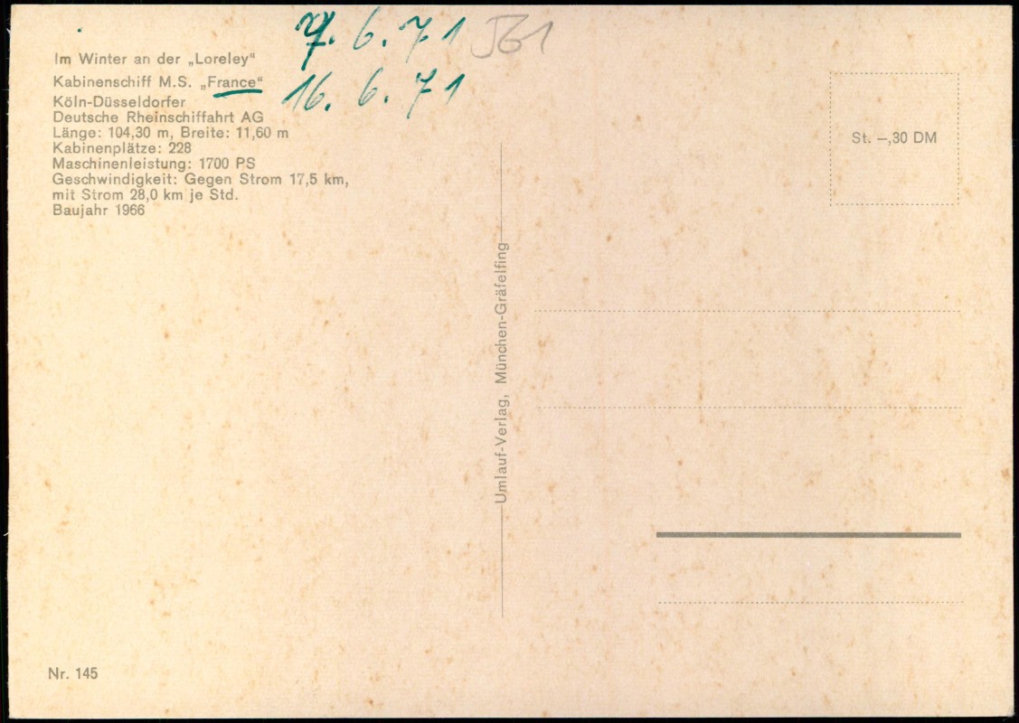 Postcart: Rheintal an der Loreley Winter Kabinenschiff M.S. France - Sankt Goar