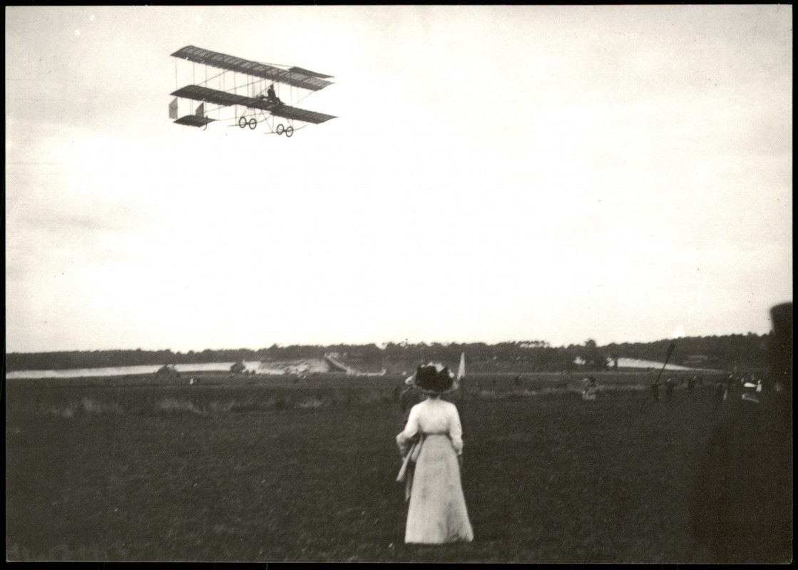 - Gustav Blondeau in flight on Farman Biplane., Historisches Flugzeug