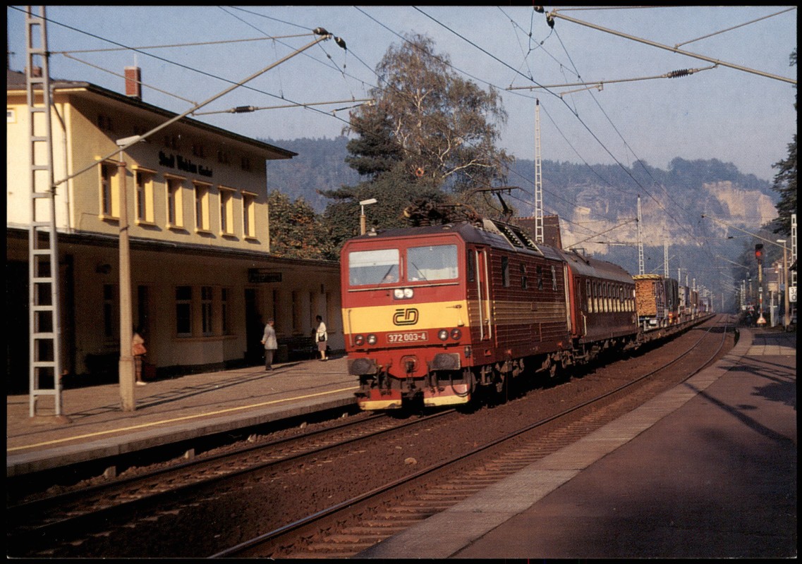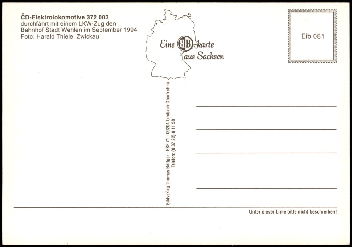 Photo Card: Eisenbahn Lokomotive ČD-Elektrolokomotive 372 003 im Bahnhof Stadt Wehlen