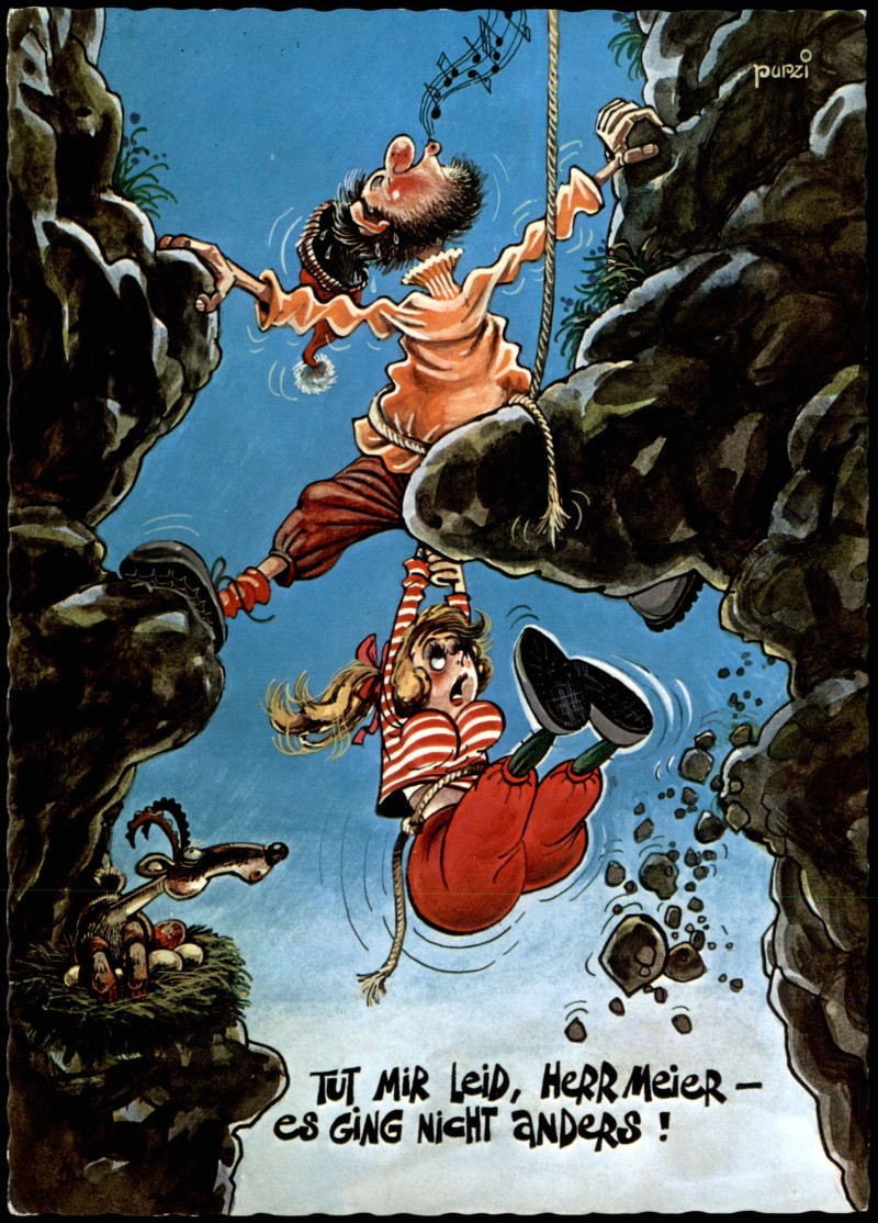 Postcart: Scherzkarte Bergsteigen - TuT MIR leiD, HERR Meier - es GING NICHT ANDERS !