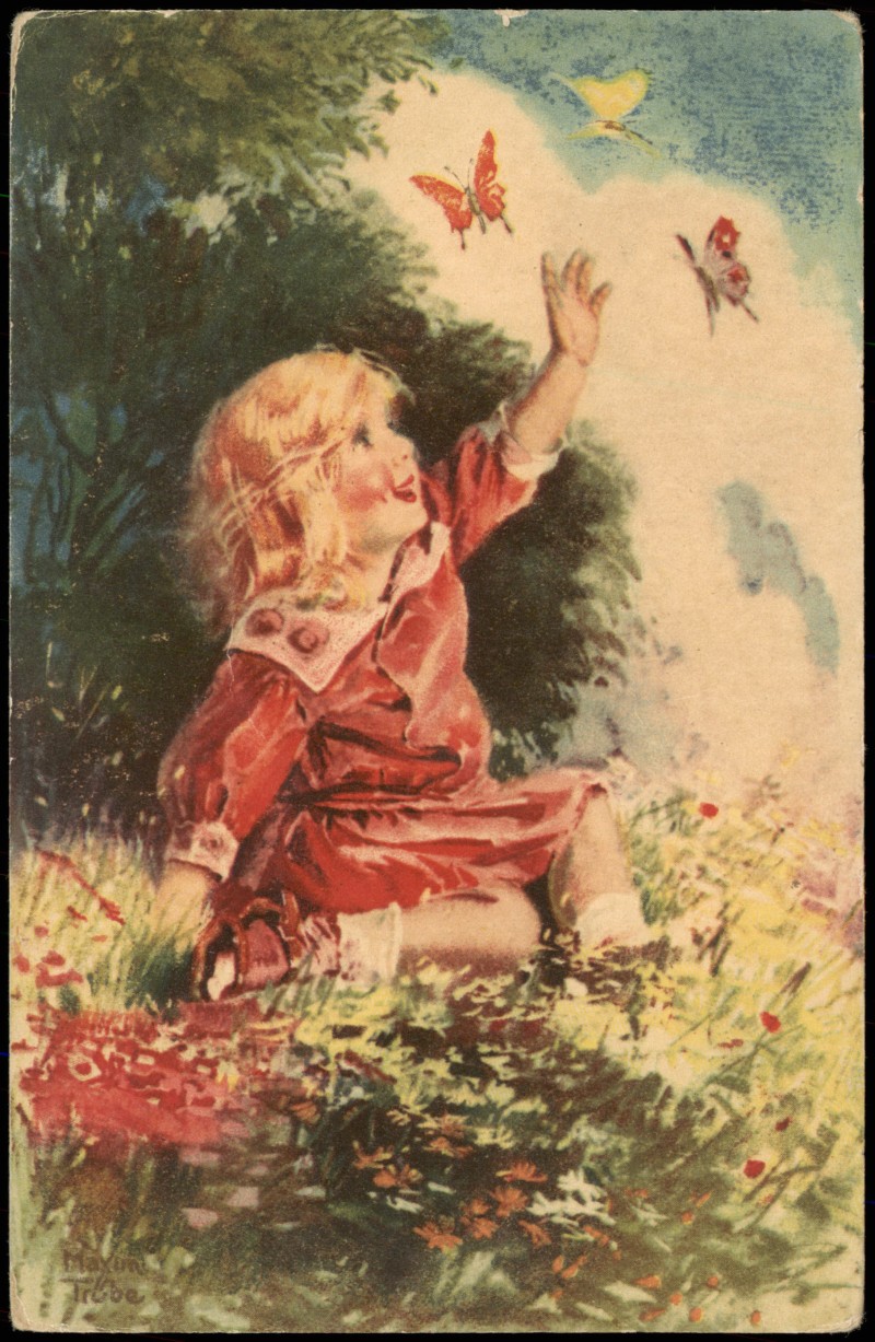 Postcart: Kinder Künstlerkarte Junge spielt mit Schmetterlingen