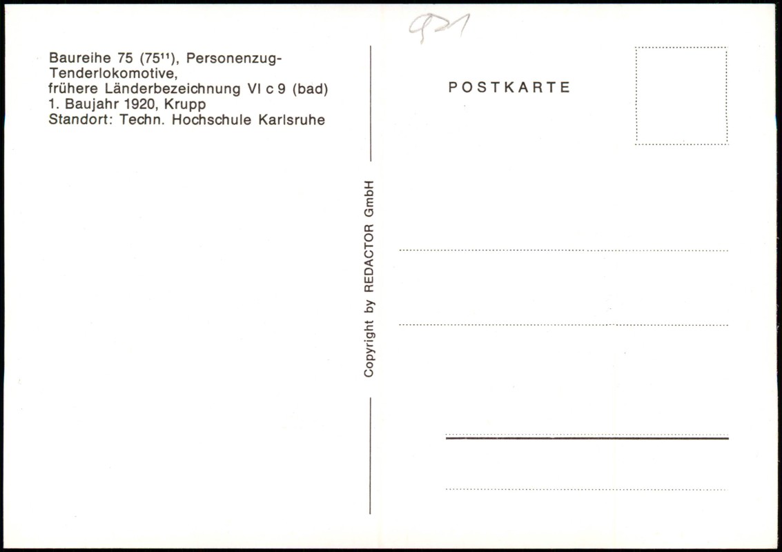 Photo Card: Baureihe 75 (7511), Personenzug-Tenderlokomotive, Standort Karlsruhe Hochschule