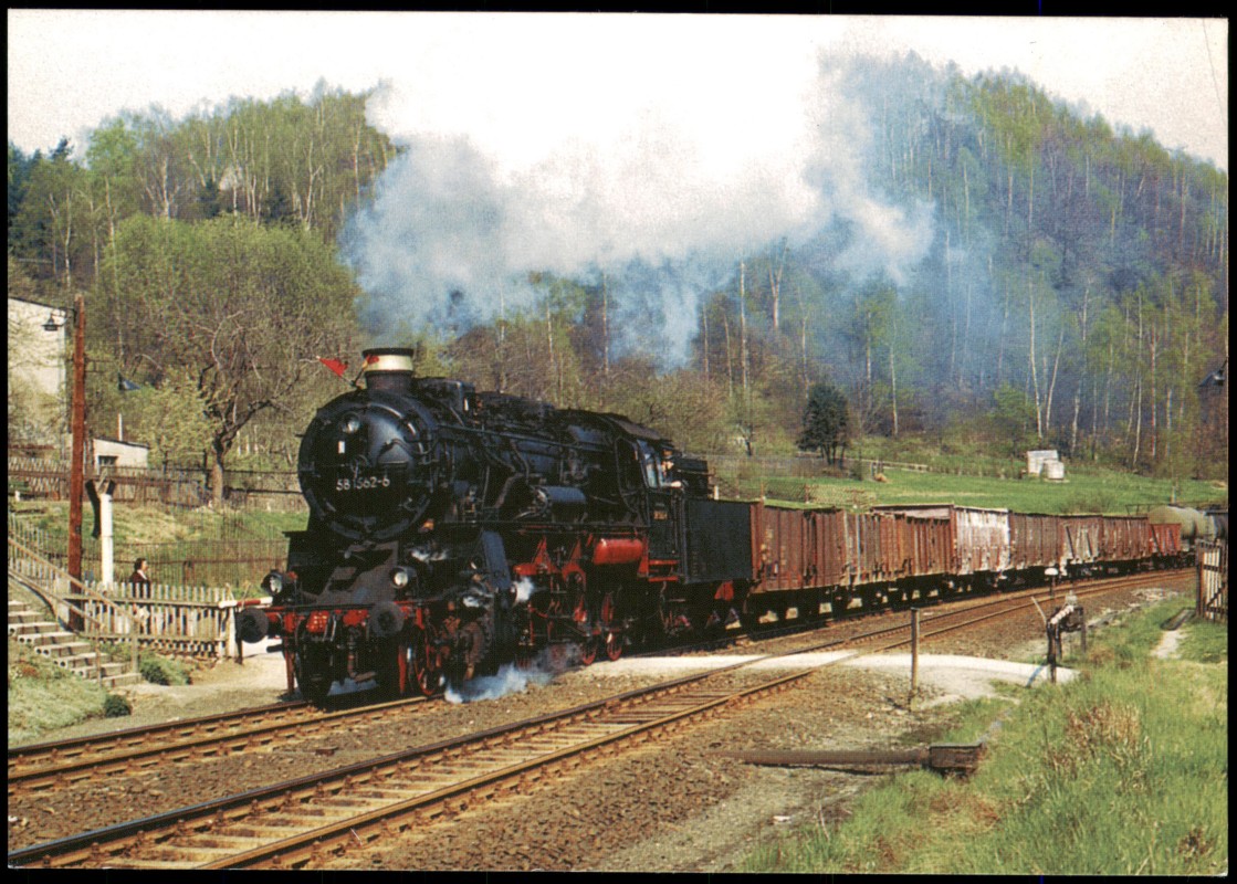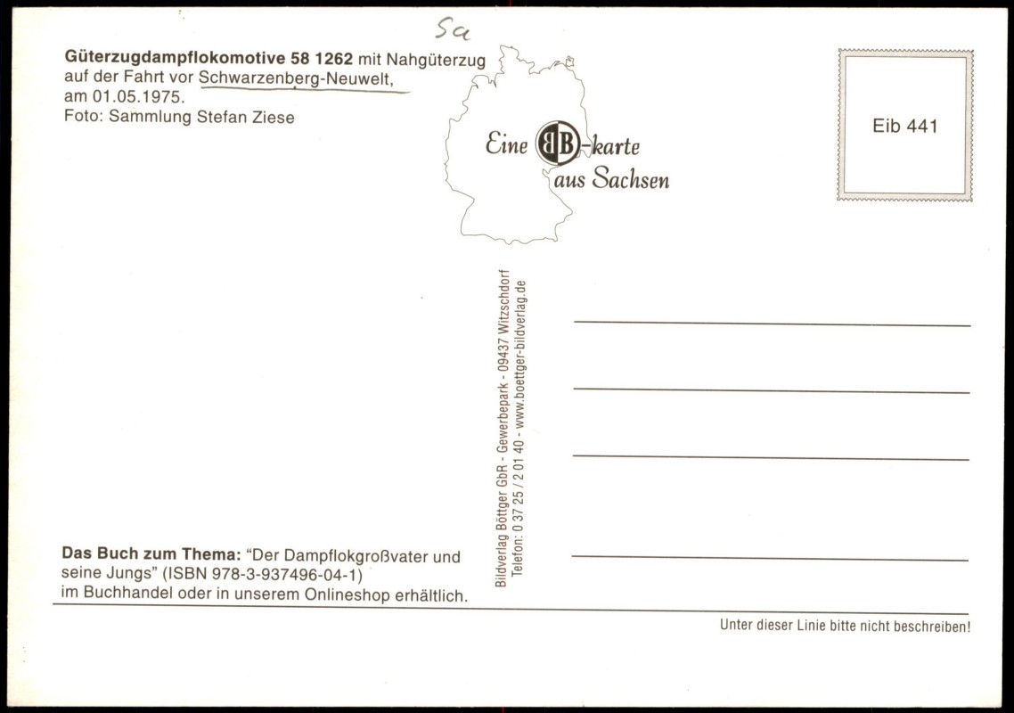 - Die Ansichtskarte zeigt die Güterzugdampflokomotive 58 1262 mit einem Nahgüterzug auf der Fahrt vor Schwarzenberg-Neuwelt. Das Foto stammt aus der Sammlung Stefan Ziese und wurde am 01.05.1975 aufgenommen. Die Karte ist eine 'B-Karte aus Sachsen' und wurde vom Bildverlag Böttger GbR (09437 Witzschdorf) herausgegeben. Die Seriennummer der Karte ist Eib 441.