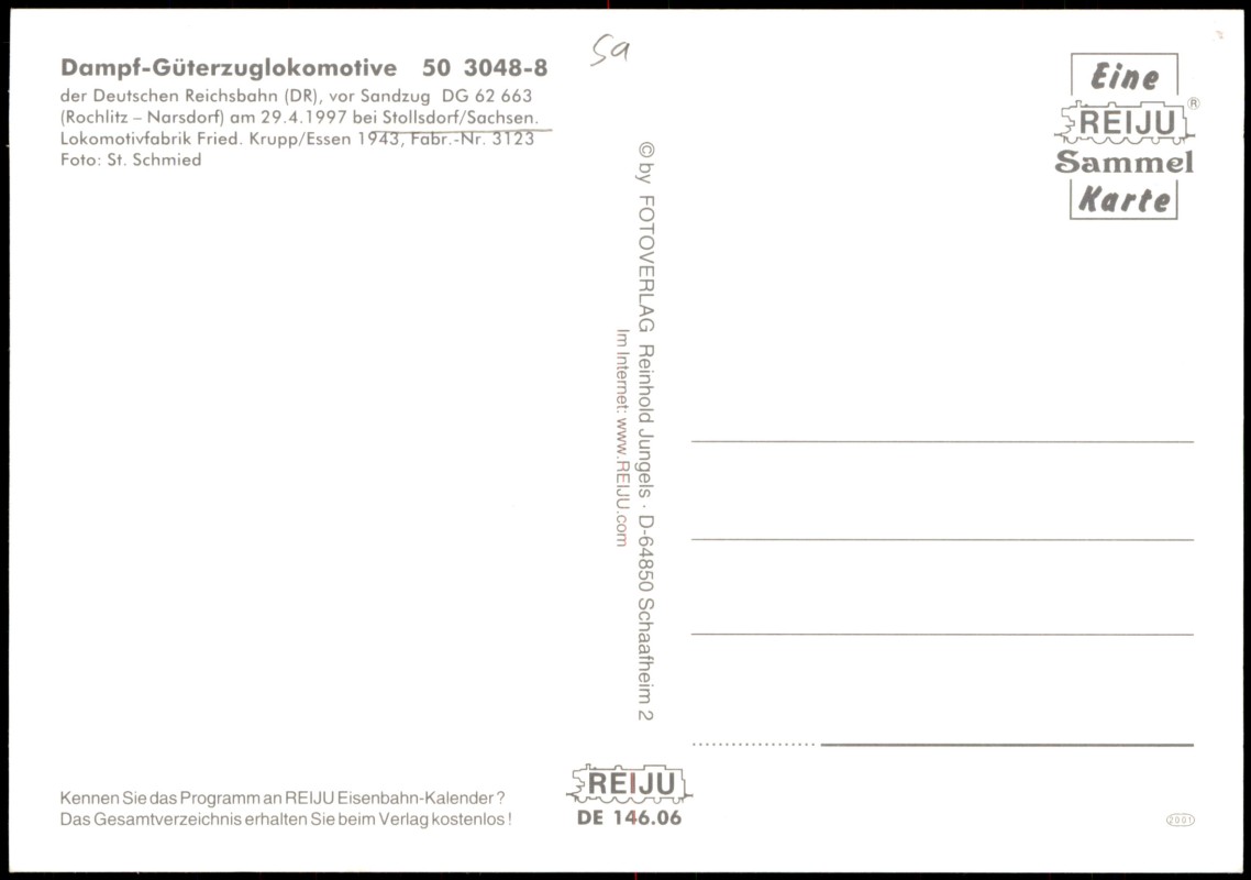 - Eine Dampf-Güterzuglokomotive der Baureihe 50, Nummer 50 3048-8, der Deutschen Reichsbahn (DR), zieht einen Sandzug (DG 62 663) auf der Strecke Rochlitz-Narsdorf. Die Aufnahme entstand am 29. April 1997 bei Stollsdorf in Sachsen. Die Lokomotive wurde 1943 von Fried. Krupp in Essen unter der Fabriknummer 3123 gebaut. Das Foto stammt von St. Schmied. Die Karte ist eine 'REIJU Sammel Karte' des FOTOVERLAG Reinhold Jungels, der auch Eisenbahn-Kalender anbietet.