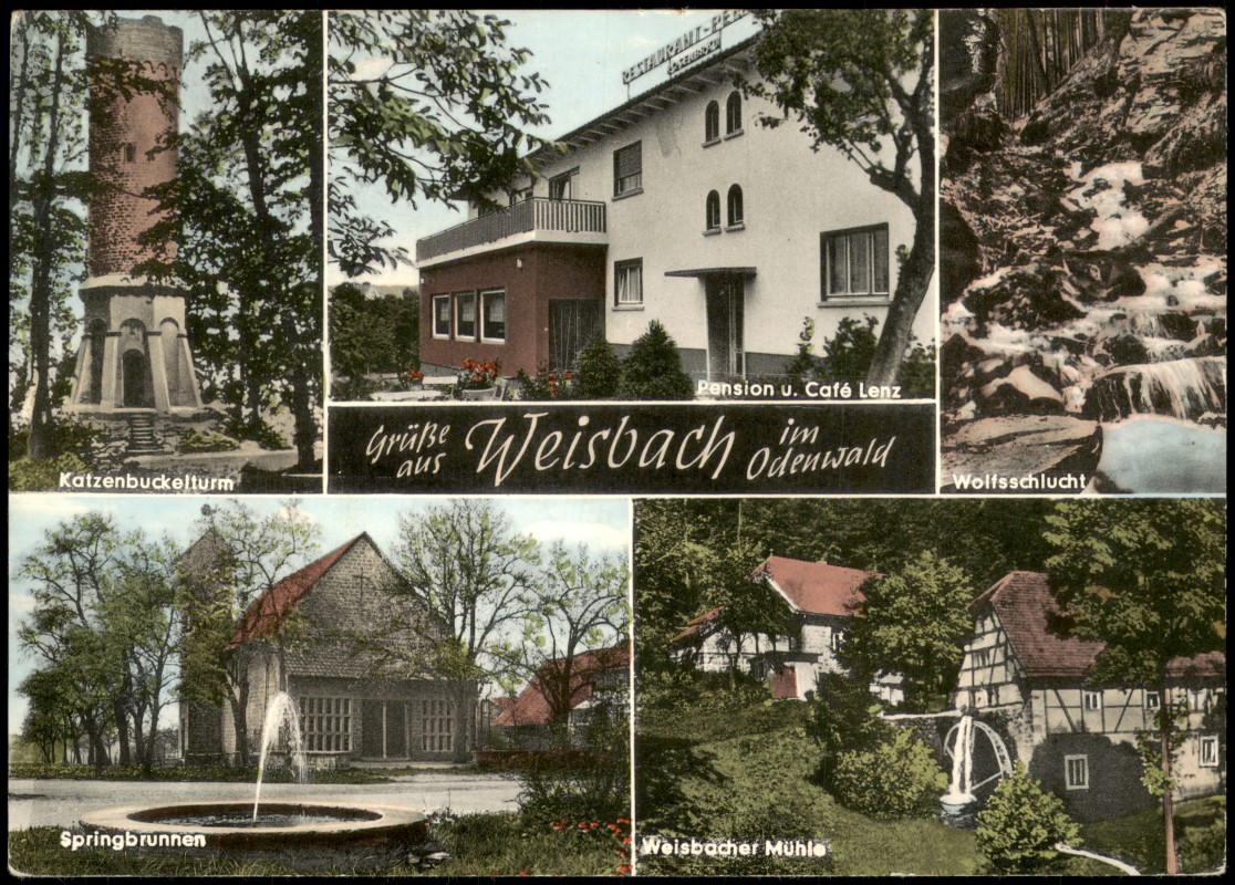 Photo Card: Mehrbild-AK mit Katzenbuckelturm Pension u. Café Lenz Weisbacher Mühle Wolfsschlucht - Weisbach-Waldbrunn (Odenwald)