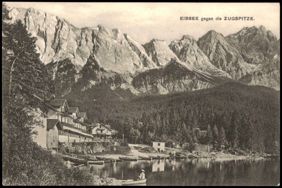 Postcart: Eibsee Bootsanlegestelle gegen die ZUGSPITZE. - Garmisch-Partenkirchen