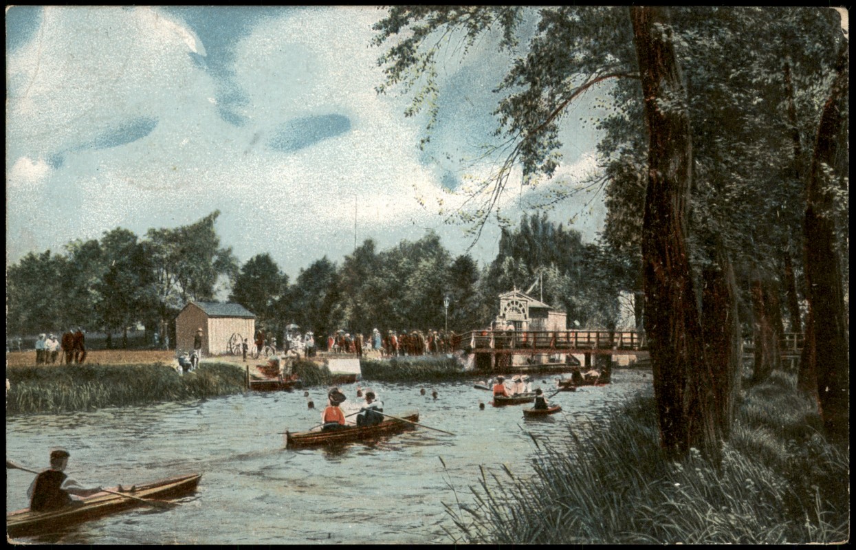 Postcart: Bewegtes Leben auf und am Fluß Ruderer