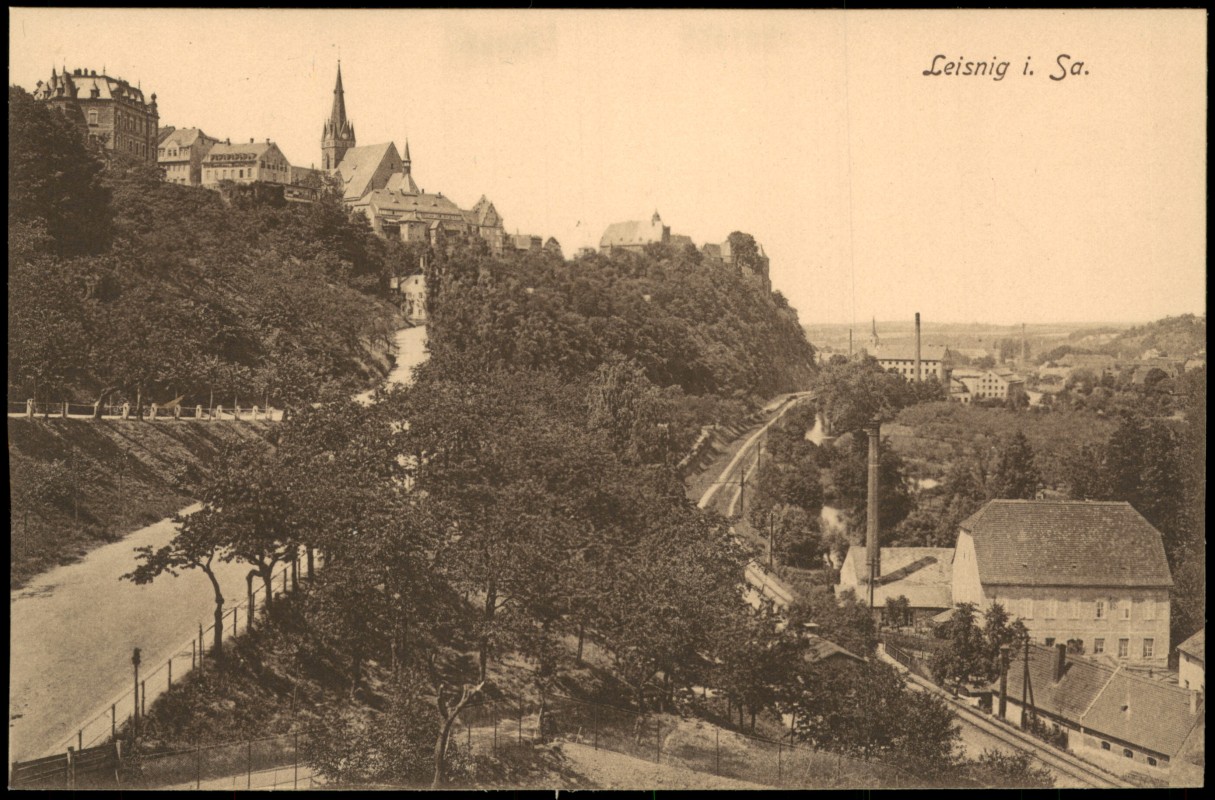 Postcart: Stadt Fabrik Bahnstrecke - Leisnig