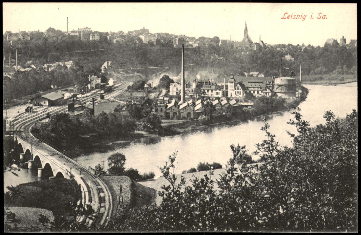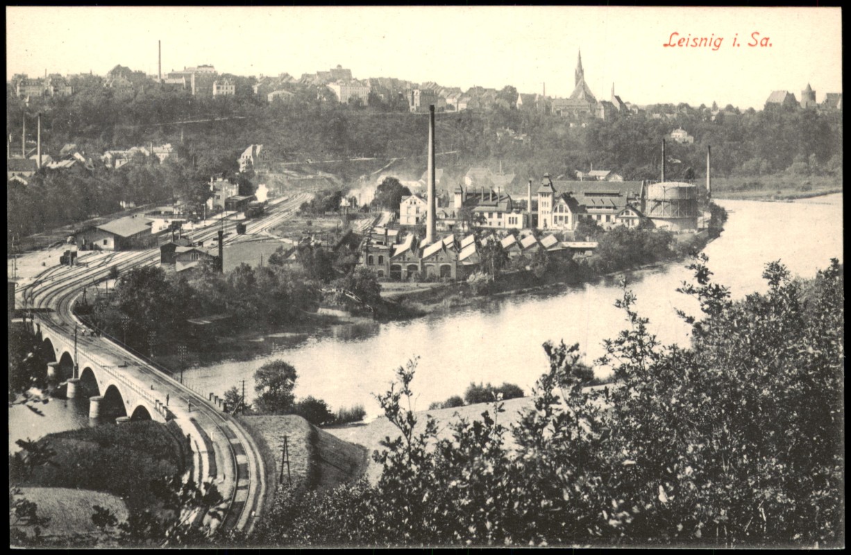 Postcart: Bahnhof, Brücke und Industrieanlagen - Leisnig