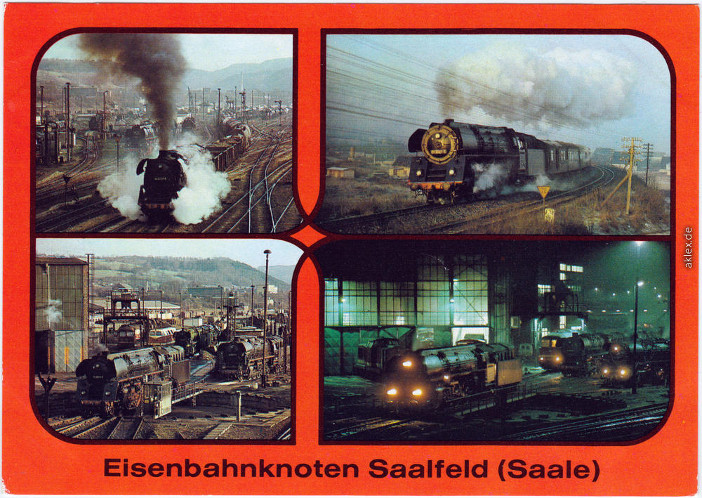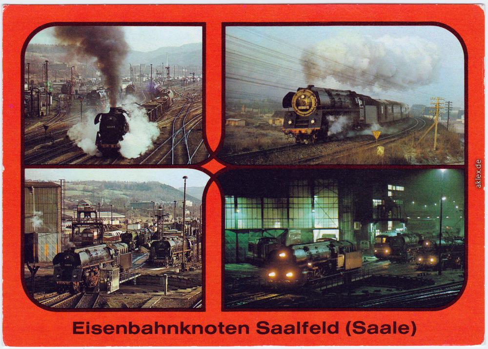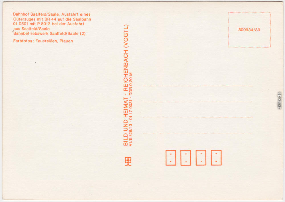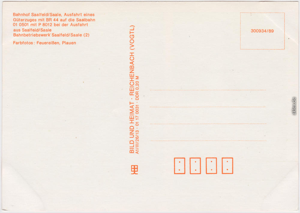 Postcart: Bahnhof, Ausfahrt eines Güterzuges - Saalfeld