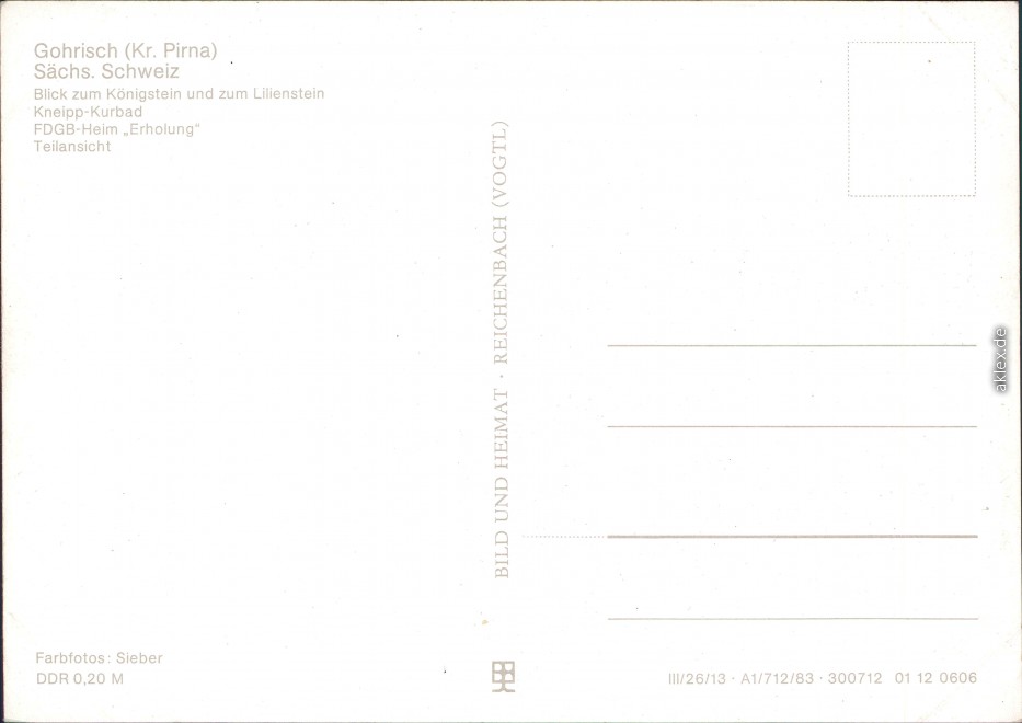 Postcart: Blick zum Königstein und zum Lilienstein, Kneipp - Kurbad, FDGB-Heim "Erholung", Teilansicht - Gohrisch (Sächs. Schweiz)