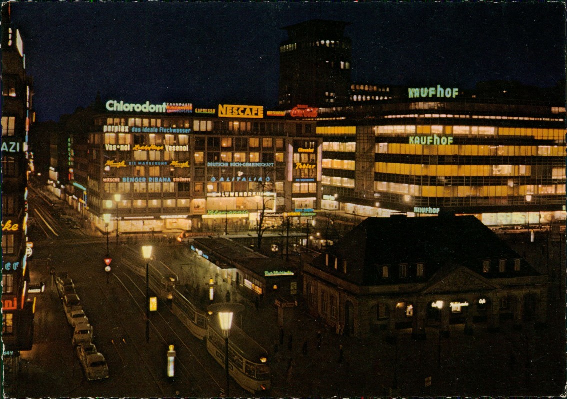 - Hauptwache, Tram Straßenbahn, Kaufhof, Leuchtreklame bei Nacht