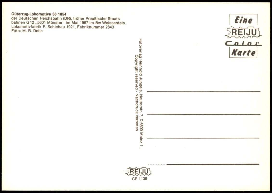 - Dampflokomotive der Baureihe 58, genauer die Güterzug-Lokomotive 58 1854 der Deutschen Reichsbahn (DR). Ursprünglich als Preußische Staatsbahn G 12 gebaut. Letzte große Untersuchung im Mai 1961 im BW Wiesenfels. Hergestellt von Lokomotivfabrik F. Schichau im Jahr 1921, Fabriknummer 2843. Die Lokomotive ist in Schwarz mit roten Rädern und Gestängen dargestellt, auf Gleisen stehend, mit einem Gebäude im Hintergrund. Foto von R. Delle.
