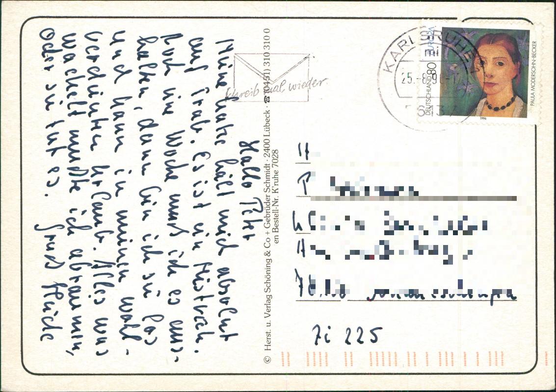- Moderne Farbfotografie-Mehrbildkarte. Die obere Bildhälfte zeigt eine Luftaufnahme des Karlsruher Schlosses mit den umliegenden Gartenanlagen. Die unteren drei Einzelbilder zeigen die Staatliche Kunsthalle, den Marktplatz mit der charakteristischen Pyramide sowie den Marktplatz mit dem Großherzog-Ludwig-Denkmal. Rückseitig findet sich der Verlagsaufdruck von Schöning & Co + Gebrüder Schmidt aus Lübeck.