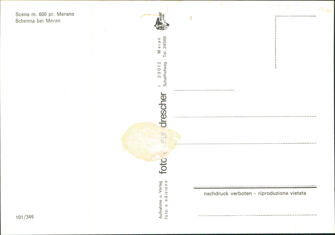 - Farbfotografie einer Panorama-Ansicht von Schenna bei Meran in Südtirol. Im Bildzentrum sind das Schloss Schenna, die Pfarrkirche Maria Himmelfahrt und das markante neugotische Mausoleum von Erzherzog Johann zu sehen. Die Gebäude liegen auf einer Anhöhe über terrassierten Weinbergen vor der Kulisse verschneiter Alpengipfel. Herausgegeben von Foto Drescher, Meran.