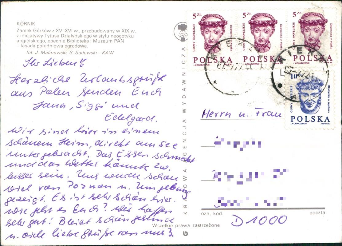 - Ansichtskarte von Schloss Kórnik (Zamek Górków), dargestellt ist die südliche Gartenfassade. Das Bauwerk aus dem XV.-XVI. Jahrhundert wurde im XIX. Jahrhundert auf Initiative von Tytus Działyński im englischen neugotischen Stil umgebaut. Es beherbergt heute eine Bibliothek und ein Museum der Polnischen Akademie der Wissenschaften (PAN). Die Fotografie stammt von J. Malinowski und S. Sadowski. Herausgegeben von Krajowa Agencja Wydawnicza (KAW).