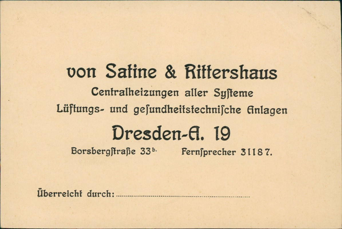 Postcart: Reklame Werbung Satine & Rittershaus Centralheizungen Lüftungssysteme Dresden-A. 19