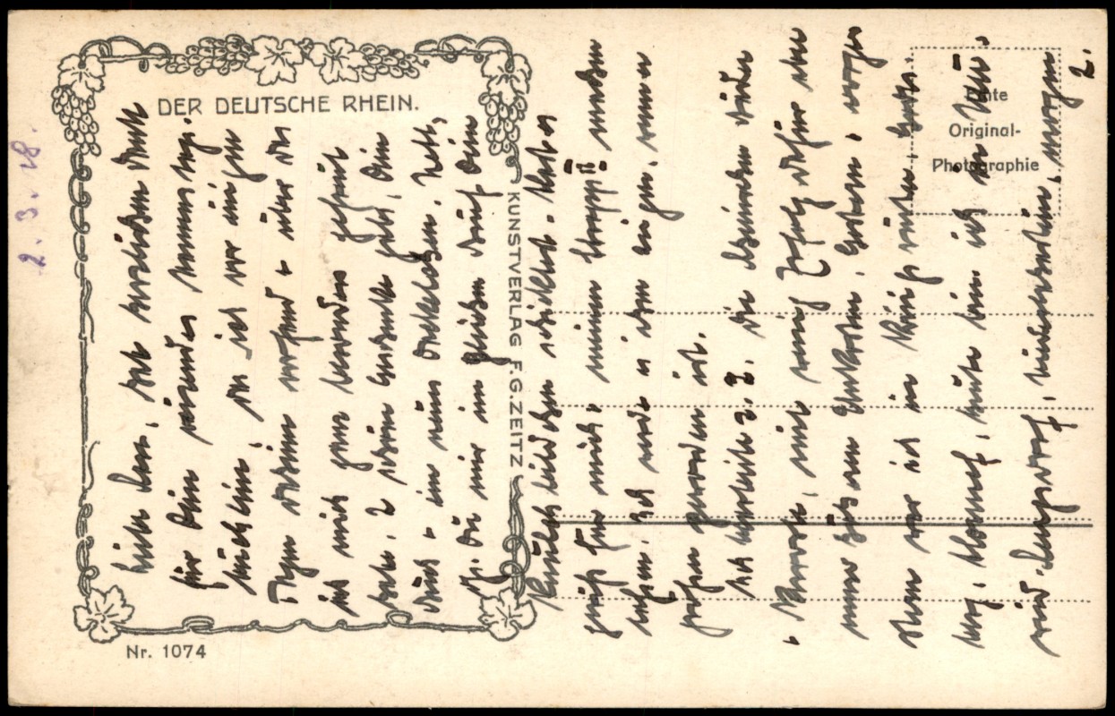 - Echtfoto-Postkarte (Original-Photographie) mit einer Panorama-Ansicht vom Drachenfels in das Rheintal. Auf der rechten Seite ist die markante Burgruine Drachenfels erkennbar. Die Karte gehört zur Serie 'DER DEUTSCHE RHEIN' und wurde vom Kunstverlag F.G. Zeitz unter der Nummer 1074 veröffentlicht.