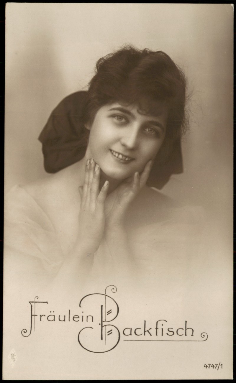 - Serienkarte FRÄULEIN BACKFISCH Hübsche junge Frau Porträt-Foto